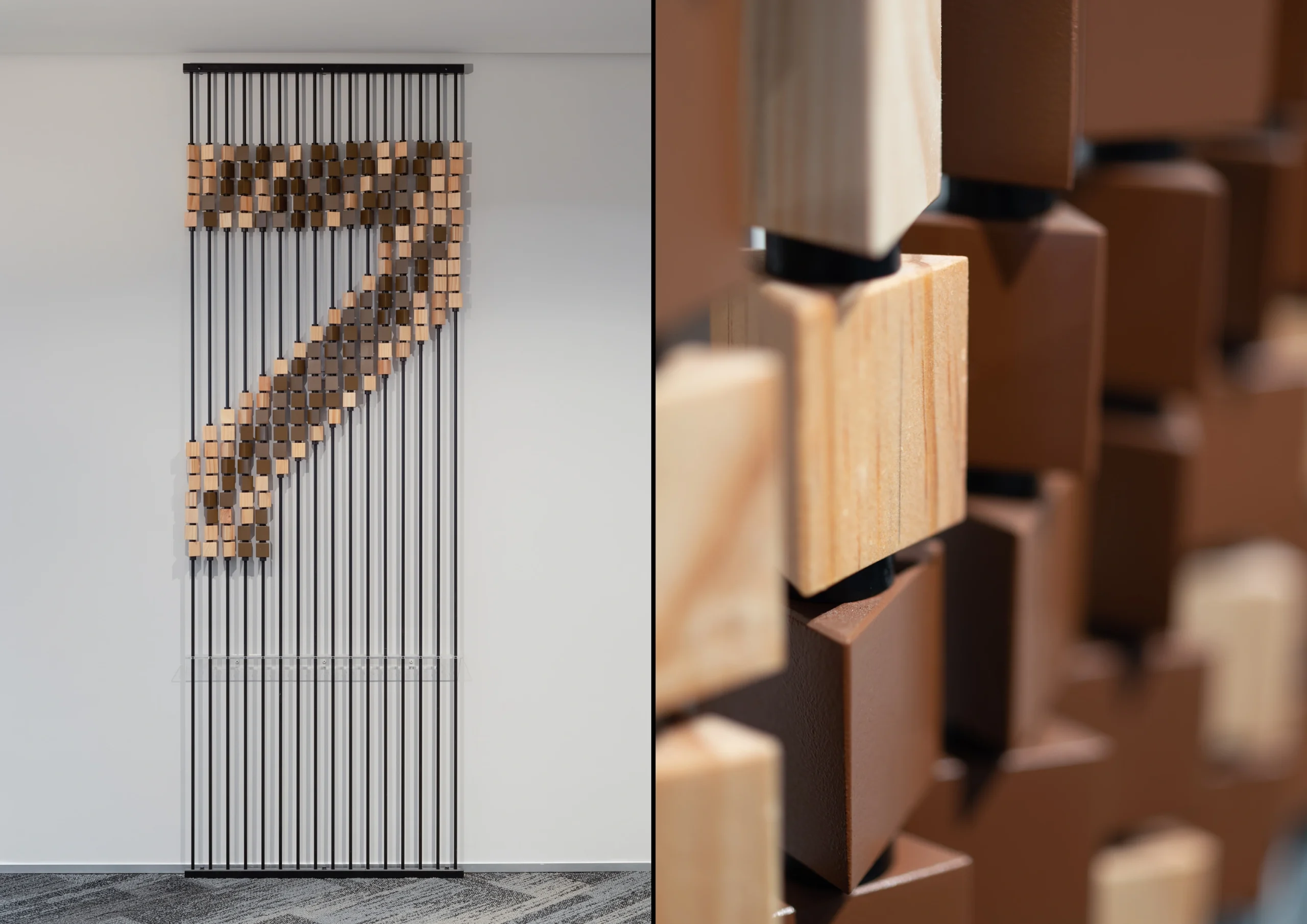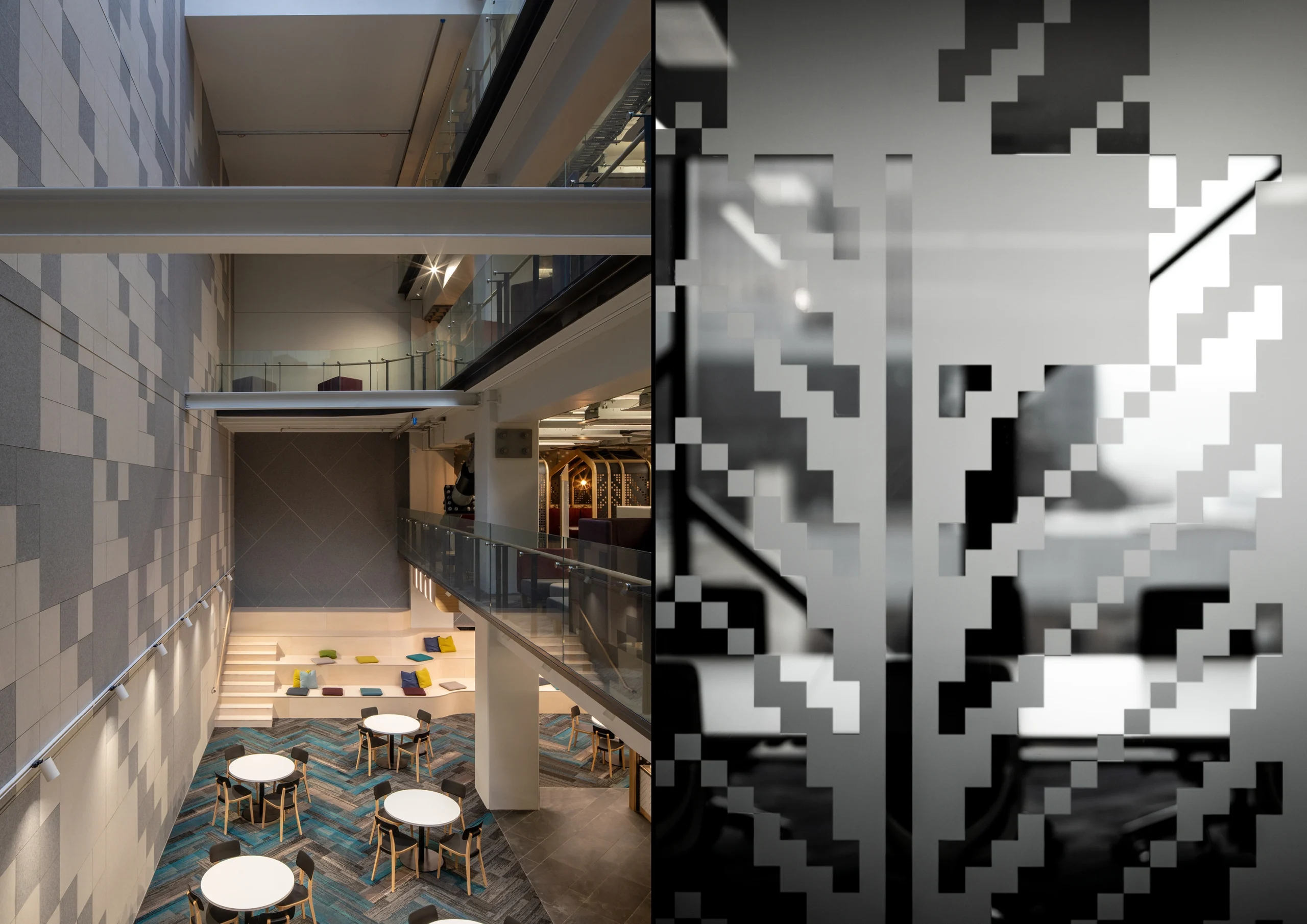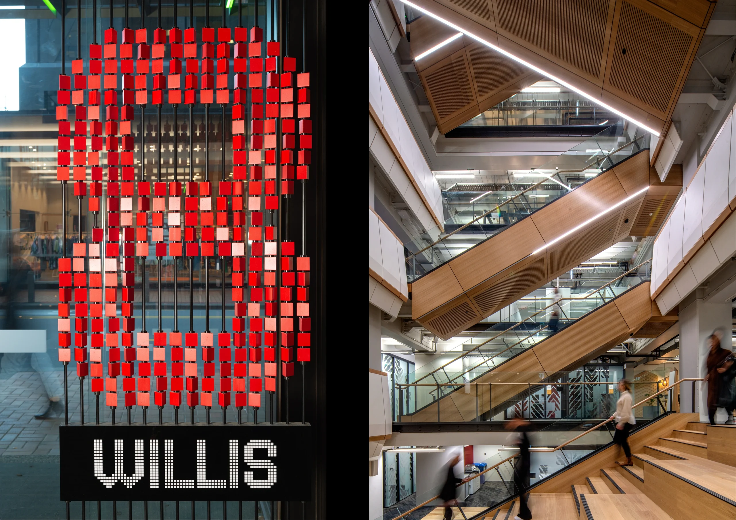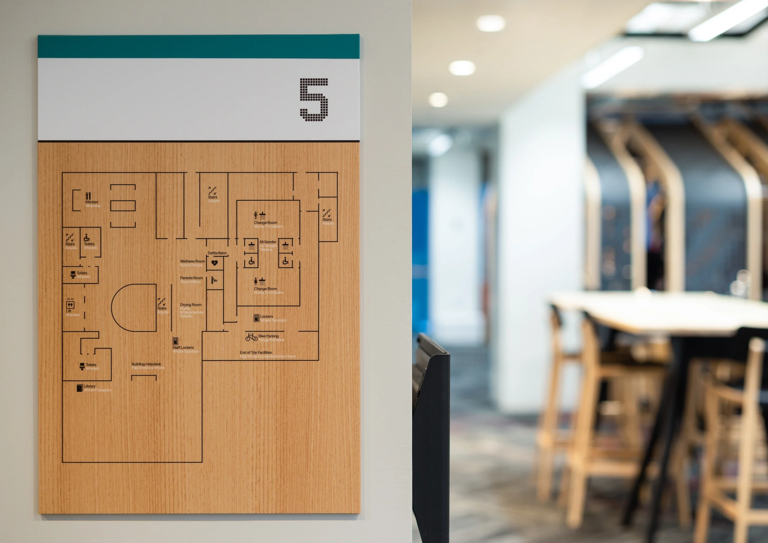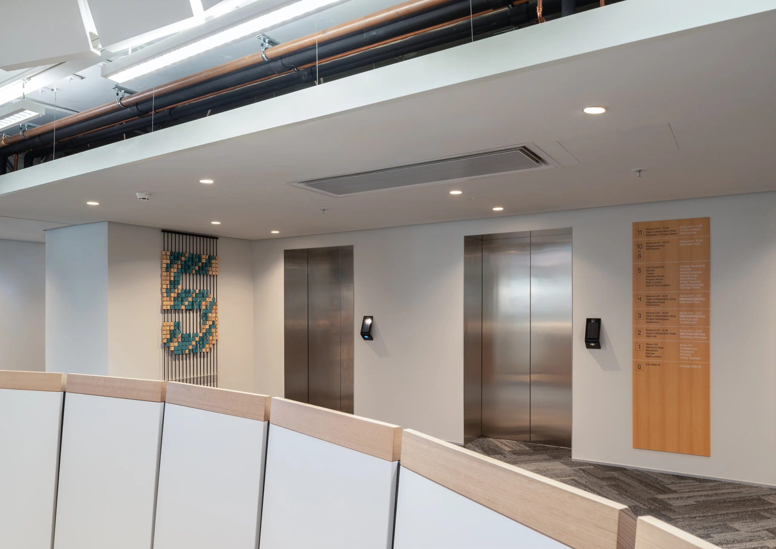 Expressed through distinct sign types, bespoke typography, and icon set, the forms of Tāniko weaving, Abacus, and Fibonacci form a cohesive narrative throughout the space. Level identifications serve as site-specific artworks, featuring Fibonacci patterns and colours from the interior palette to create visual landmarks.