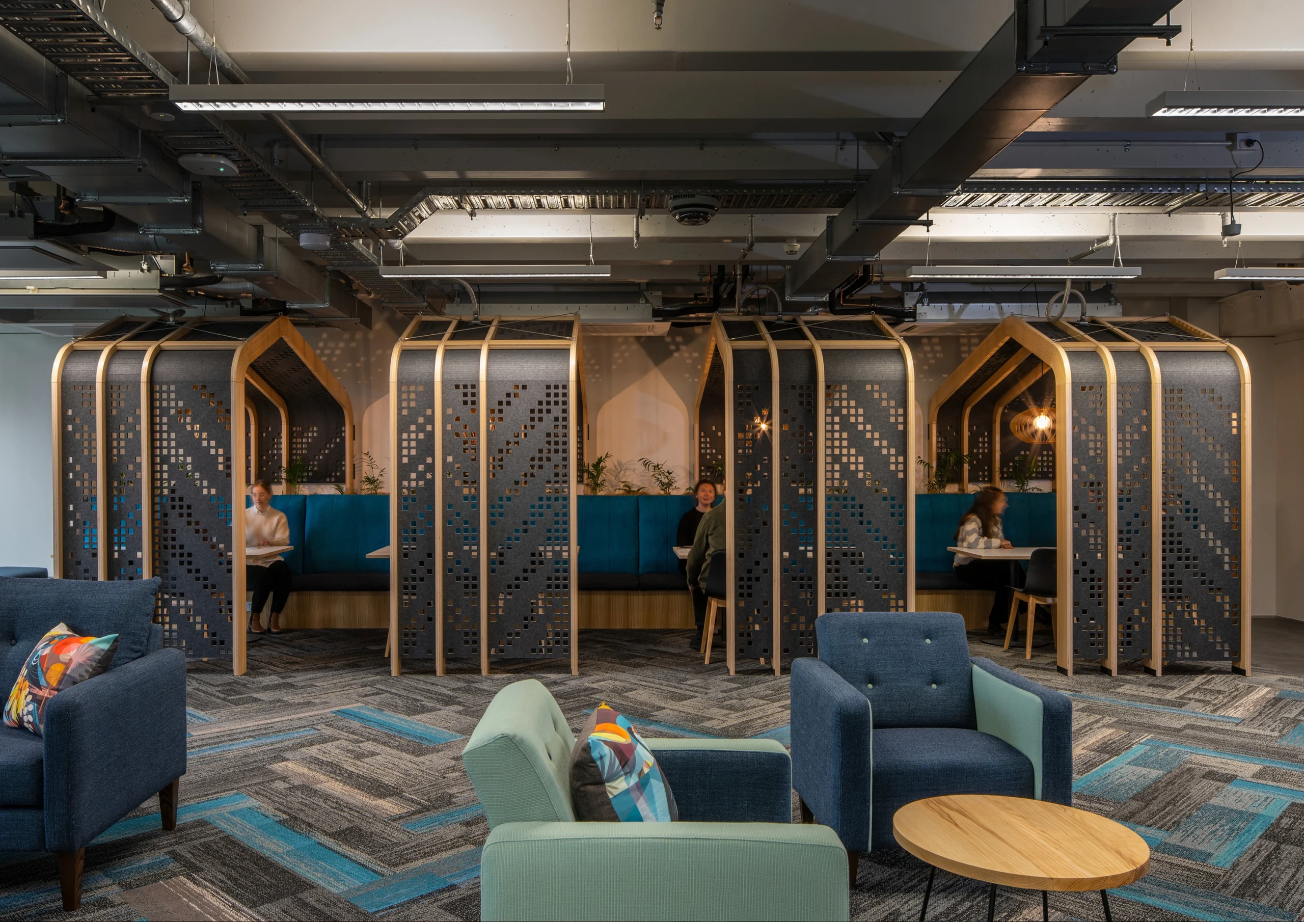 Fibonacci elements seamlessly integrate into the fit-out, adorning kai stations, acoustic surfaces, glazing manifestations, and meeting room walls. Functional signage is thoughtfully executed using timber-look panels and typographic graphics, harmonizing with the overall design scheme.